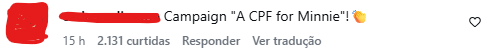 Alguns internautas disseram nas redes que ela merecia ter um CPF no Brasil. Um dos comentários dizia: “Campaign “A CPF for Minnie”! (Campanha, um CPF para Minnie; em português). Veja mais abaixo outros comentários.