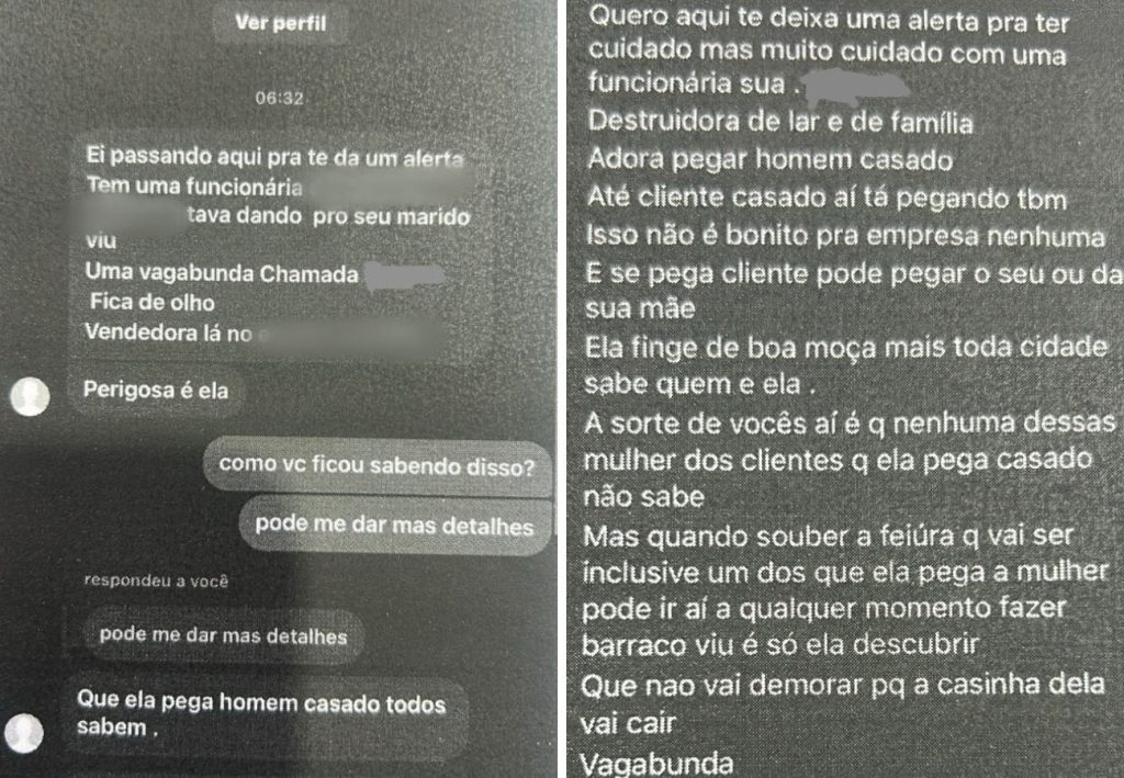 “Destruidora de lar e de família. Adora pegar homem casado. Até cliente casado aí tá pegando. Isso não é bonito para empresa nenhuma e se pega cliente, pode pegar o seu ou da sua mãe. Ela finge de boa moça, mas toda cidade sabe quem ela é”.